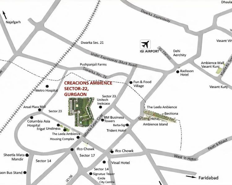 Ambience Creacions location is strategically located on MG Road, Sector 22, Gurgaon with excellent connectivity to NH-48, Cyber City, and IGI Airport.