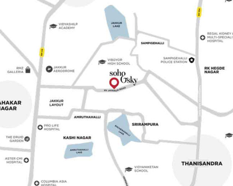 Assetz Soho and Sky Jakkur is an extremely well-connected project which provides excellent access and connectivity to the surrounding areas. It offers great access to the Hebbal, Thanisandra and North Bangalore regions. It is also close to several major landmarks and locations such as the Manyata Tech Park, Phoenix Mall of Asia, Vibgyor High School and the PKS School.