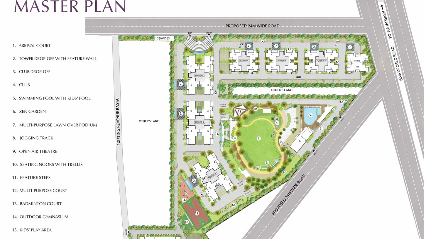 Urban Ascent Gurgaon offers amenities such as a clubhouse, jogging track, yoga pavilion, zen garden, multi-purpose lawn, open-air theatre, kids’ play area, swimming pool with kids’ pool, squash court, café, banquet hall, badminton and multi-purpose courts, pet park, and seating zones.