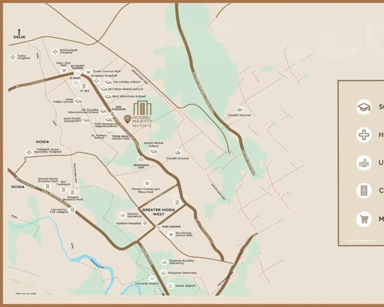 Godrej Majesty location is Sector 12, Noida near Noida–Greater Noida Expressway.