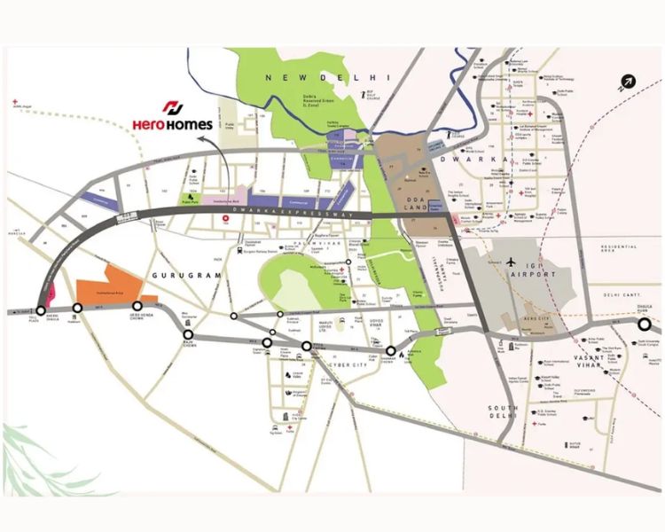 The hero homes palatial Sector 104 location advantage is business hubs, schools, hospitals, metro, local transport, and the Indira Gandhi International Airport.
