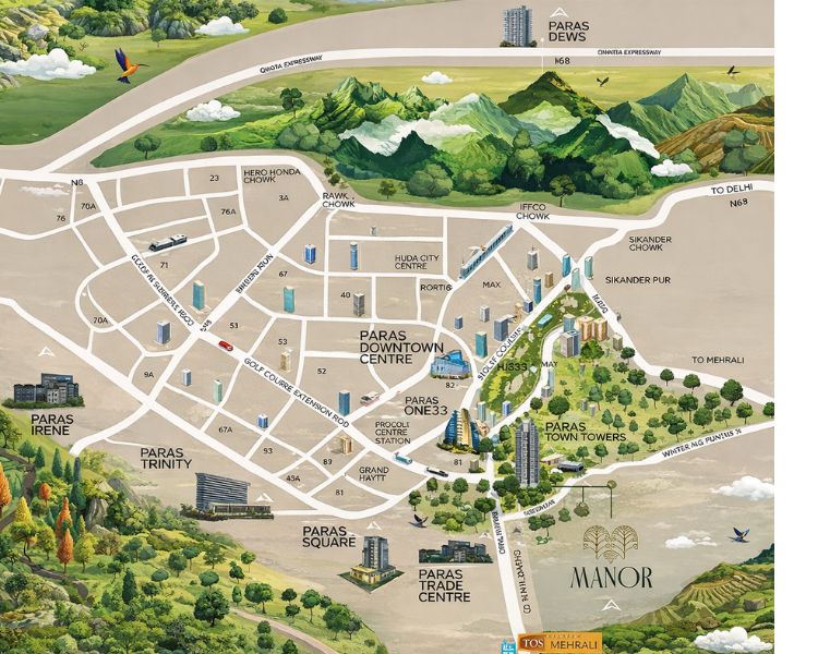 Paras The Manor is a luxury high-rise residential project located at Gwal Pahari, Gurugram, offering a nature-inspired lifestyle with premium architecture, sustainable design, and exclusive living experiences.