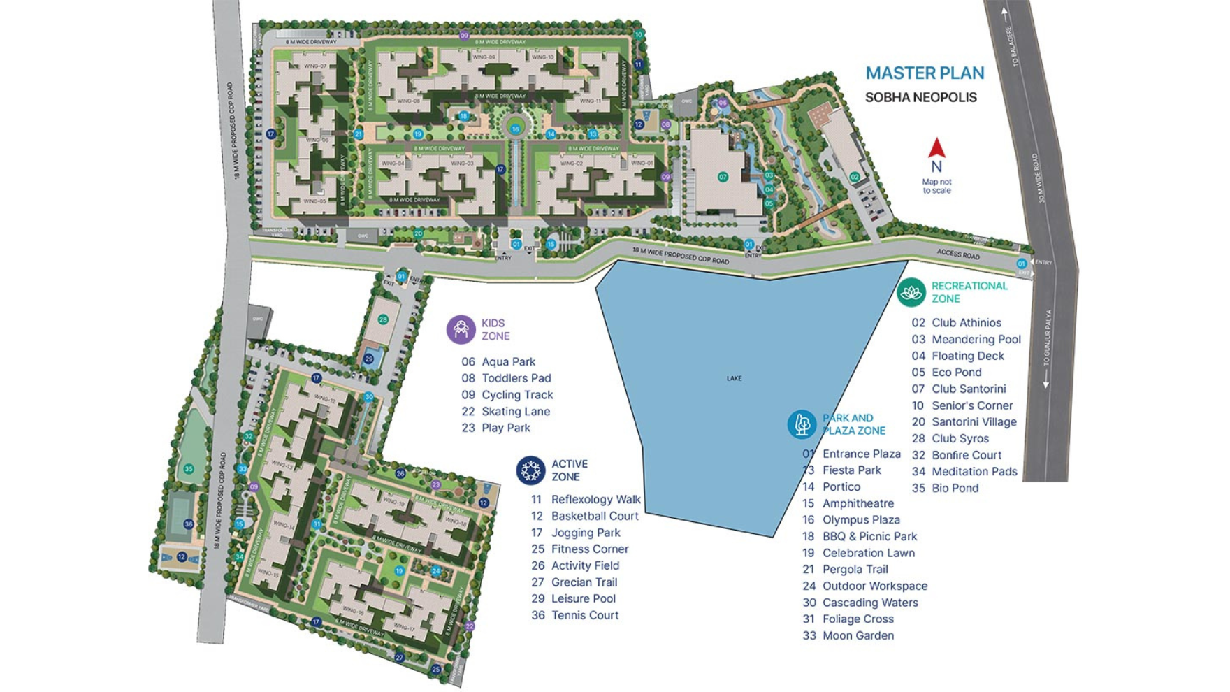 Sobha Neopolis amenities include a grand clubhouse, swimming pool, gym, tennis court, landscaped gardens, amphitheatre, jogging tracks, kids’ play zones, and 24/7 power backup.