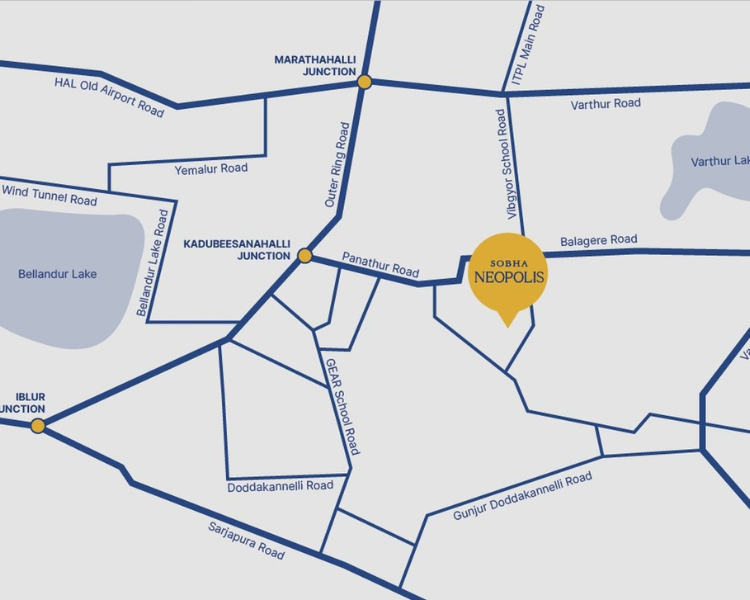 Sobha Neopolis is located on Panathur Road, Bangalore East, close to Outer Ring Road, Whitefield, Marathahalli, and Bellandur, offering seamless access to IT parks and major business hubs.